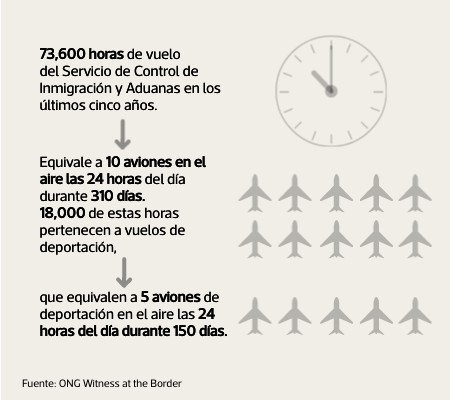 Equivale a 10 aviones en el aire las 24 horas del día durante 310 días. 18,000 de estas horas pertenecen a vuelos de deportación,