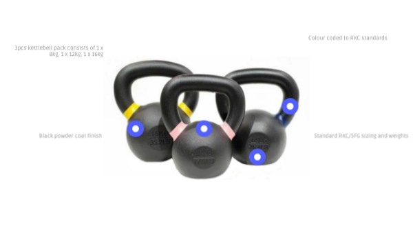 3pcs kettlebell pack consists of 1 x 8kg, 1 x 12kg, 1 x 16kg