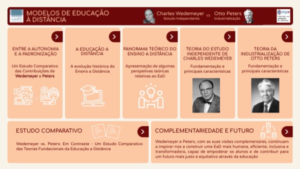 Este trabalho pretende explorar e confrontar as teorias de dois pioneiros incontornáveis da EaD: Charles Wedemeyer e Otto Peters. De um lado, Wedemeyer, com a sua visão humanista e inovadora, centrou-se no aluno como agente principal da aprendizagem, defendendo a autonomia e a flexibilidade como elementos cruciais para o sucesso na educação a distância. Do outro lado, Peters, com uma abordagem mais sistemática e influenciada pela era industrial, analisou a EaD como um processo que poderia ser otimizado e industrializado para alcançar a máxima eficiência e escalabilidade, utilizando a tecnologia como ferramenta central. Ao longo desta apresentação, iremos abordar as principais características de cada teoria, identificar os seus pontos de convergência e divergência, e refletir sobre como estas perspetivas moldaram e continuam a moldar o futuro da educação online