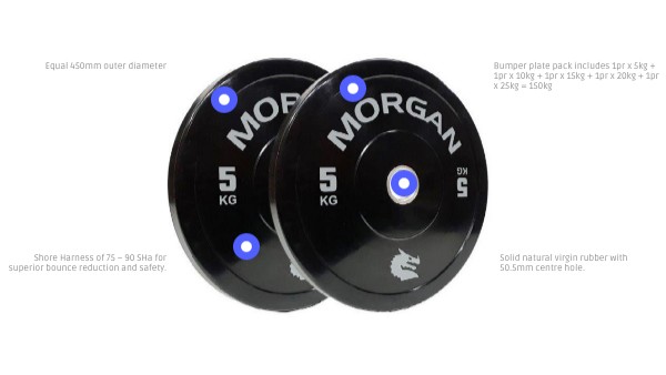 Bumper plate pack includes 1pr x 5kg + 1pr x 10kg + 1pr x 15kg + 1pr x 20kg + 1pr x 25kg = 150kg