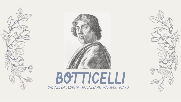Allievo di Filippo Lippi, da lui apprende la tecnica pittorica e il gusto per le figure aggraziate. Le fondamentali caratteristiche dello stile di Sandro Botticelli sono:- un armonioso equilibrio compositivo, - un disegno sottile e molto dinamico - una linea precisa e ondeggiante - dipinge a tempera- usa colori brillanti