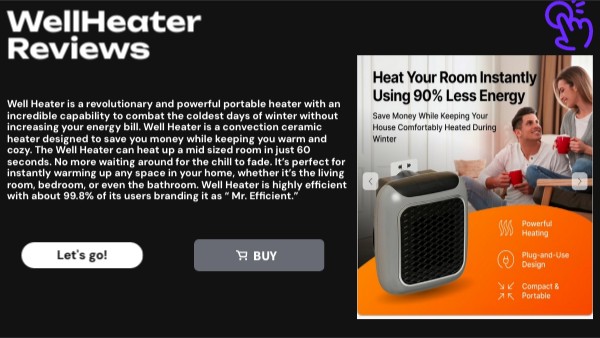 Well Heater is a revolutionary and powerful portable heater with an incredible capability to combat the coldest days of winter without increasing your energy bill. Well Heater is a convection ceramic heater designed to save you money while keeping you warm and cozy. The Well Heater can heat up a mid sized room in just 60 seconds. No more waiting around for the chill to fade. It’s perfect for instantly warming up any space in your home, whether it’s the living room, bedroom, or even the bathroom. Well Heater is highly efficient with about 99.8% of its users branding it as “ Mr. Efficient.”