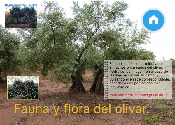 Esta aplicación le permitirá acceder a muchos organismos del olivar. Podrá ver su imagen, en el caso de las aves escuchar su canto, y pulsando el enlace correspondiente, acceder a una página con más información. Para ver instrucciones pulse aquí.