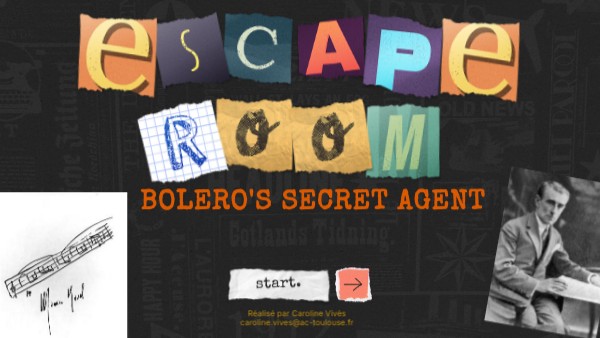 Votre mission:Vous êtes un agent secret débutant qui aspire à devenir un agent secret professionnel. Pour y parvenir, vous devez infiltrer le monde de la musique et de la danse, et résoudre les 3 missions différentes qui apparaissent sur la carte, afin de retrouver le manuscrit du Boléro de Ravel. Mais attention, pour cela, il vous faudra mener l'enquête et le compositeur va tester vos connaissances avant de vous faire confiance ! Si vous recueillez tous les indices et que vous retrouvez le manuscrit de Ravel, vous deviendrez un agent secret confirmé. Bonne chance !