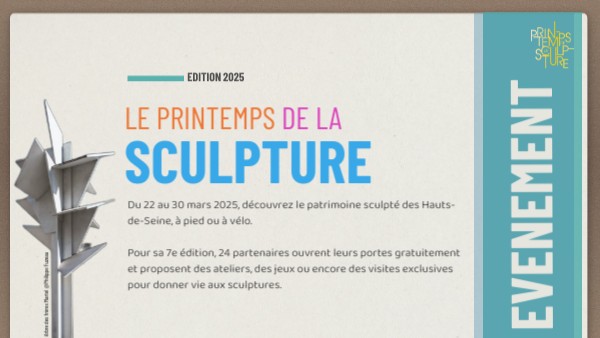 Du 22 au 30 mars 2025, découvrez le patrimoine sculpté des Hauts-de-Seine, à pied ou à vélo. Pour sa 7e édition, 24 partenaires ouvrent leurs portes gratuitement et proposent des ateliers, des jeux ou encore des visites exclusives pour donner vie aux sculptures.