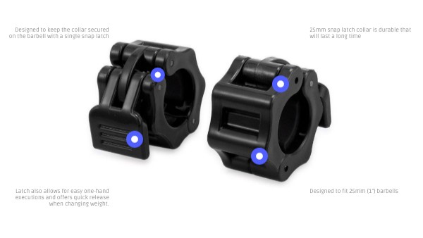 Designed to keep the collar secured on the barbell with a single snap latch