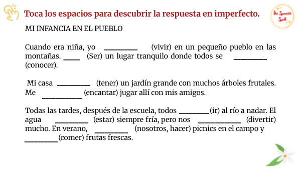 MI INFANCIA EN EL PUEBLO Cuando era niña, yo (vivir) en un pequeño pueblo en las montañas. (Ser) un lugar tranquilo donde todos se (conocer). Mi casa (tener) un jardín grande con muchos árboles frutales. Me (encantar) jugar allí con mis amigos. Todas las tardes, después de la escuela, todos (ir) al río a nadar. El agua (estar) siempre fría, pero nos (divertir) mucho. En verano, (nosotros, hacer) picnics en el campo y (comer) frutas frescas.