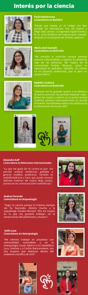 María José GuzmánLicenciatura en Nutrición “Me encanta la nutrición porque permite prevenir enfermedades y mejorar la calidad de vida de las personas. Me inspiro en la nutricionista Andrea Márquez, quien se especializó en pediatría. También, me enfoco en mi proyecto profesional, que es abrir mi propia clínica”.