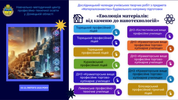 НМЦ ПТО у Донецькій області з 03.02.2025 року по 21.02.2025 року організовує проведення дослідницького челенджу учнівських творчих робіт з предмета «Матеріалознавство» будівельного напряму підготовки. Метою проведення челенджу є стимулювання дослідницького інтересу, розвиток творчих здібностей, сприяння формуванню міждисциплінарного підходу у вивченні будівельних технологій та впровадження інноваційного підходу до навчання. До участі запрошуються педагоги будівельного напрямку підготовки, викладачі історичної галузі, здобувачі освіти та всі, хто зацікавлений в історичному та практичному вивченні матеріалів. Ця подія стане унікальною можливістю для учасників продемонструвати свою творчість та дослідити еволюцію матеріалів – від первісних кам’яних знарядь до інноваційних високотехнологічних розробок, заснованих на нанотехнологіях. Особливу увагу має бути приділено практичному аналізу впливу різних матеріалів на розвиток будівельної галузі.