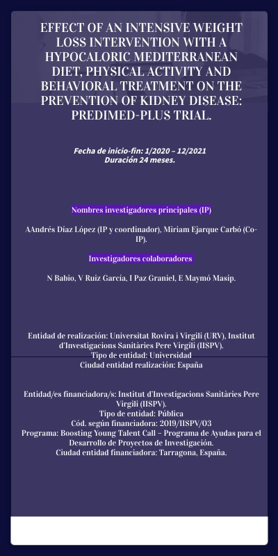 EFFECT OF AN INTENSIVE WEIGHT LOSS INTERVENTION WITH A HYPOCALORIC MEDITERRANEAN DIET, PHYSICAL ACTIVITY AND BEHAVIORAL TREATMENT ON THE PREVENTION OF KIDNEY DISEASE: PREDIMED-PLUS TRIAL.