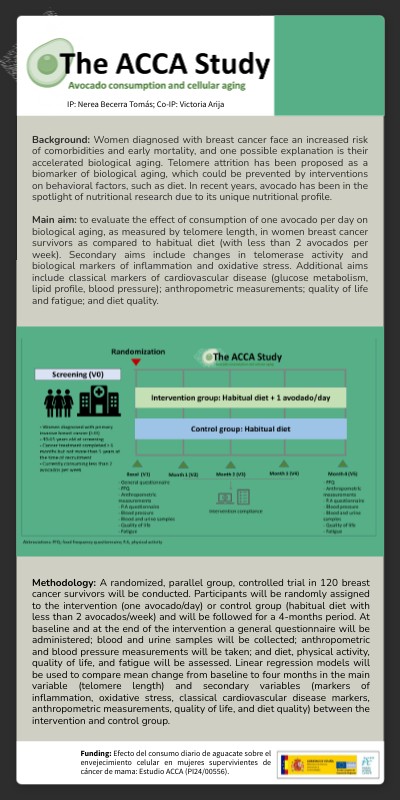 Funding: Efecto del consumo diario de aguacate sobre el envejecimiento celular en mujeres supervivientes de cáncer de mama: Estudio ACCA (PI24/00556).