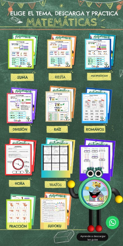 A veces los padres no saben como explicarles los temas de matemáticas; sumas, restas, multiplicación, división, fracciones, decimales, conjuntos, regla de tres entre otros, y aquí encontraran material de apoyo solo son tres pasos: elegir, descargar e imprimir. Si tienes una pregunta escríbenos