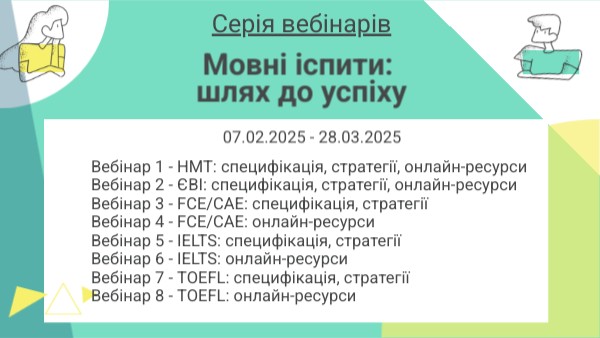 Bебінар 1 - НМТ: специфікація, стратегії, онлайн-ресурси Bебінар 2 - ЄВІ: специфікація, стратегії, онлайн-ресурси Bебінар 3 - FCE/CAE: специфікація, стратегії Bебінар 4 - FCE/CAE: онлайн-ресурси Bебінар 5 - IELTS: специфікація, стратегії Bебінар 6 - IELTS: онлайн-ресурси Bебінар 7 - TOEFL: специфікація, стратегії Bебінар 8 - TOEFL: онлайн-ресурси