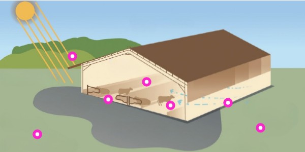 Protéger les animaux du rayonnement direct ou indirect du soleil à l'intérieur du bâtiment (limiter les ouvertures de toit, installer des débords de toitures, des bardages coulissants, des rideaux ...)
