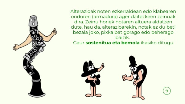 Alterazioak noten ezkerraldean edo klabearen ondoren (armadura) ager daitezkeen zeinuak dira. Zeinu horiek notaren altuera aldatzen dute, hau da, alterazioarekin, notak ez du beti bezala joko, pixka bat gorago edo beherago baizik. Gaur sostenitua eta bemola ikasiko ditugu
