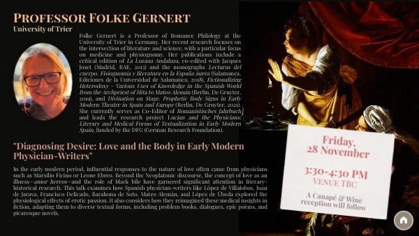 In the early modern period, influential responses to the nature of love often came from physicians such as Marsilio Ficino or Leone Ebreo. Beyond the Neoplatonic discourse, the concept of love as an illness—amor hereos—and the role of black bile have garnered significant attention in literary-historical research. This talk examines how Spanish physician-writers like López de Villalobos, Juan de Jarava, Francisco Delicado, Barahona de Soto, Mateo Alemán, and López de Úbeda explored the physiological effects of erotic passion. It also considers how they reimagined these medical insights in fiction, adapting them to diverse textual forms, including problem books, dialogues, epic poems, and picaresque novels.