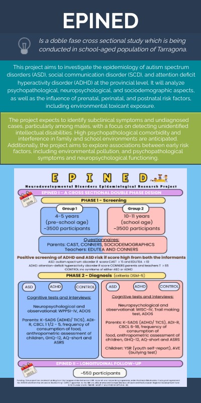 This project aims to investigate the epidemiology of autism spectrum disorders (ASD), social communication disorder (SCD), and attention deficit hyperactivity disorder (ADHD) at the provincial level. It will analyze psychopathological, neuropsychological, and sociodemographic aspects, as well as the influence of prenatal, perinatal, and postnatal risk factors, including environmental toxicant exposure.