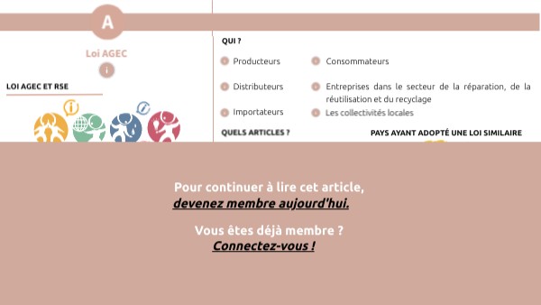 Obligation pour les entreprises de la mode et du textile de publier des informations sur les produits qu'elles mettent sur le marché, notamment sur leur durée de vie, leur recyclabilité et leur impact environnemental, depuis 2022 pour certaines d'entre elles, avec interdiction de certaines allégations environnementales. Voir contenu : Article 13 de la loi AGEC