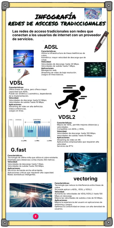 Características: Mejora de VDSL, permite mejores distancias y velocidades. Compatible con ADSL y VDSL. Velocidad: Velocidades de descarga: hasta 100 Mbps. Velocidades de subida: hasta 50 Mbps. Aplicaciones: Streaming de video en 4K. Aplicaciones empresariales que requieren alta velocidad. Servicios de IPTV.