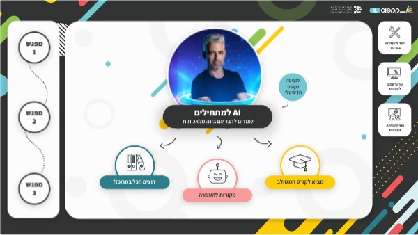 "היי כולם! תודה שהשתתפתם בקורס 'AI בגובה העיניים'. במהלך המפגשים שלנו גילינו כיצד בינה מלאכותית יכולה להפוך לכלי משמעותי בחיינו. אני מקווה שתיישמו את הכלים והתובנות שרכשתם כאן. להשלמת הקורס וקבלת התעודה: