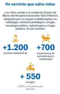 Las cifras avalan a la unidad de Cáncer de Mama del Hospital Universitari Vall d’Hebron, integrado por un equipo multidisciplinar en radiología, anatomía patológica, cirugía, oncología médica, radioterapia y cirugía plástica. Al año realizan: