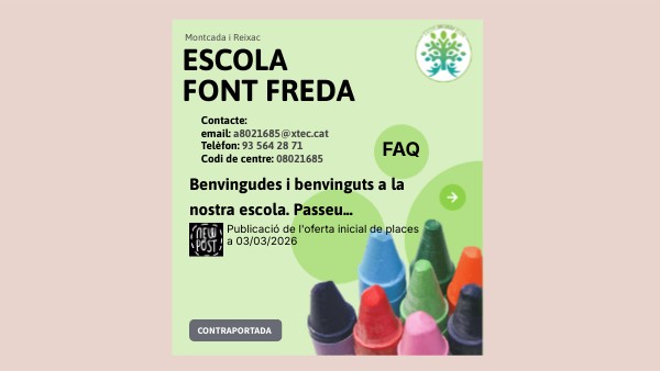 🎓 🌿📚 Som una escola d'una linia, familiar i propera, ubicada en un entorn natural privilegiat, al costat dels barris Montcada Nova i Pla d’en Coll. Els nostres espais amplis afavoreixen un aprenentatge actiu i dinàmic. ✅ Metodologies innovadores: Aprenem de manera transversal i especialitzada, amb estratègies competencials, inclusives i significatives. 🌟 Projectes destacats: 🔹 Anglès/GEP | 🔹 Pla lector | 🔹 Matemàtiques | 🔹 Escola verda 🔹 Educació emocional | 🔹 Escacs | 🔹 Música | 🔹 Setmana cultural Fem xarxa amb el municipi! Participem en activitats comunitàries i treballem conjuntament amb l'Institut de referència per garantir una transició educativa enriquidora. Vine a conèixer-nos i descobreix tot el que podem oferir! 💙✨ 📍 Escola Font Freda – Creixem junts!