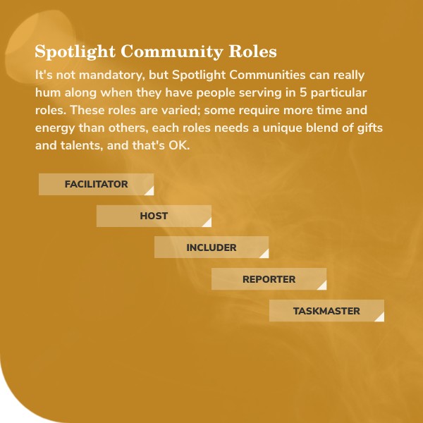 It's not mandatory, but Spotlight Communities can really hum along when they have people serving in 5 particular roles. These roles are varied; some require more time and energy than others, each roles needs a unique blend of gifts and talents, and that's OK.