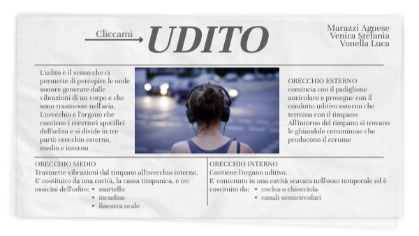 L'udito è il senso che ci permette di percepire le onde sonore generate dalle vibrazioni di un corpo e che sono trasmesse nell'aria. L'orecchio è l'organo che contiene i recettori specifici dell'udito e si divide in tre parti: orecchio esterno, medio e interno