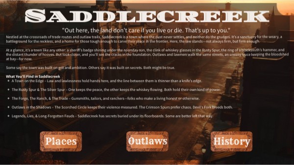 Nestled at the crossroads of trade routes and outlaw trails, Saddlecreek is a town where the dust never settles, and neither do the grudges. It’s a sanctuary for the weary, a battleground for the reckless, and a home for those tough enough to carve their place in the frontier. Here, the law stands—not always firm, but firm enough. At a glance, it’s a town like any other: a sheriff’s badge shining under the noonday sun, the clink of whiskey glasses in the Rusty Spur, the ring of a blacksmith’s hammer, and the distant thunder of hooves. But look closer, and you’ll see the cracks in the foundation. Outlaws and lawmen walk the same streets, an uneasy truce keeping the bloodshed at bay—for now. Some say the town was built on grit and ambition. Others say it was built on secrets. Both might be true. What You’ll Find in Saddlecreek 🔹 A Town on the Edge – Law and lawlessness hold hands here, and the line between them is thinner than a knife’s edge. 🔹 The Rusty Spur & The Silver Spur – One keeps the peace, the other keeps the whiskey flowing. Both hold their own kind of power. 🔹 The Forge, The Ranch, & The Trade – Gunsmiths, tailors, and ranchers—folks who make a living honest or otherwise. 🔹 Outlaws in the Shadows – The Scorched Circle keeps their violence measured. The Crimson Spurs prefer chaos. Devil’s Fork breeds both. 🔹 Legends, Lies, & Long-Forgotten Feuds – Saddlecreek has secrets buried under its floorboards. Some are better left that way.