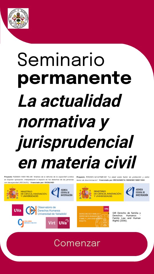 Este seminario está organizado por: - Proyecto de Investigación: Análisis de la reforma de la capacidad jurídica en España: aplicación, interpretación e impacto en los derechos de las personas con discapacidad (RECAJES) (PID 2022-140611). Finanaciado por la Agencia Estatal de Investigación. Ministerio de Ciencia, Innovación y Universidades. - Proyecto de Investigación: La edad como factor de protección y como factor de discriminación (PID2024-161427). Financiado por la Agencia Estatal de Investigación. Ministerio de Ciencia, Innovación y Universidades. - GIR Family Law & Human Rights (2006). Con la colaboración del Observatorio de Derechos Humanos de la Universidad de Valladolid y la Clínica Jurídica de la Universidad de Valladolid. Con el apoyo del Servicio de Medios Audiovisuales de la UVa.