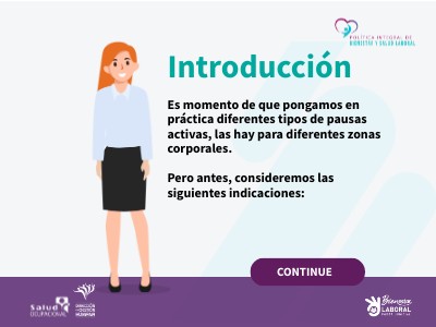 Es momento de que pongamos en práctica diferentes tipos de pausas activas, las hay para diferentes zonas corporales. Pero antes, consideremos las siguientes indicaciones: