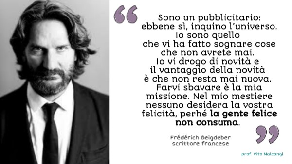 Sono un pubblicitario: ebbene sì, inquino l’universo. Io sono quello che vi ha fatto sognare cose che non avrete mai. Io vi drogo di novità e il vantaggio della novità è che non resta mai nuova. Farvi sbavare è la mia missione. Nel mio mestiere nessuno desidera la vostra felicità, perhé la gente felice non consuma.
