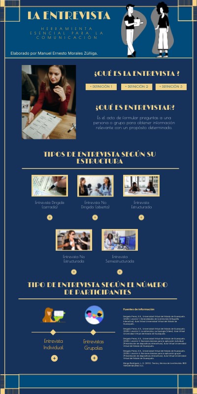 Delgado Perez, E.E., Universidad Virtual del Estado de Guanajuato. (2025). Lección 1. Generalidades de la entrevista [Infografía Interactiva]. Aula Virtual Universidad Virtual del Estado de Guanajuato. Delgado Perez, E.E., Universidad Virtual del Estado de Guanajuato. (2025). Lección 2. La entrevista y su tipología [Video]. Aula Virtual Universidad Virtual del Estado de Guanajuato. Delgado Perez, E.E., Universidad Virtual del Estado de Guanajuato. (2025). Lección 3. Nociones básicas para la aplicación individual [Presentación de diapositivas interactivas]. Aula Virtual Universidad Virtual del Estado de Guanajuato. Delgado Perez, E.E., Universidad Virtual del Estado de Guanajuato. (2025). Lección 4. Nociones básicas para la aplicación grupal [Presentación de diapositivas interactivas]. Aula Virtual Universidad Virtual del Estado de Guanajuato. Morga Rodríguez, L. E. (2012). Teoría y técnica de la entrevista. RED TERCER MILENIO S.C.