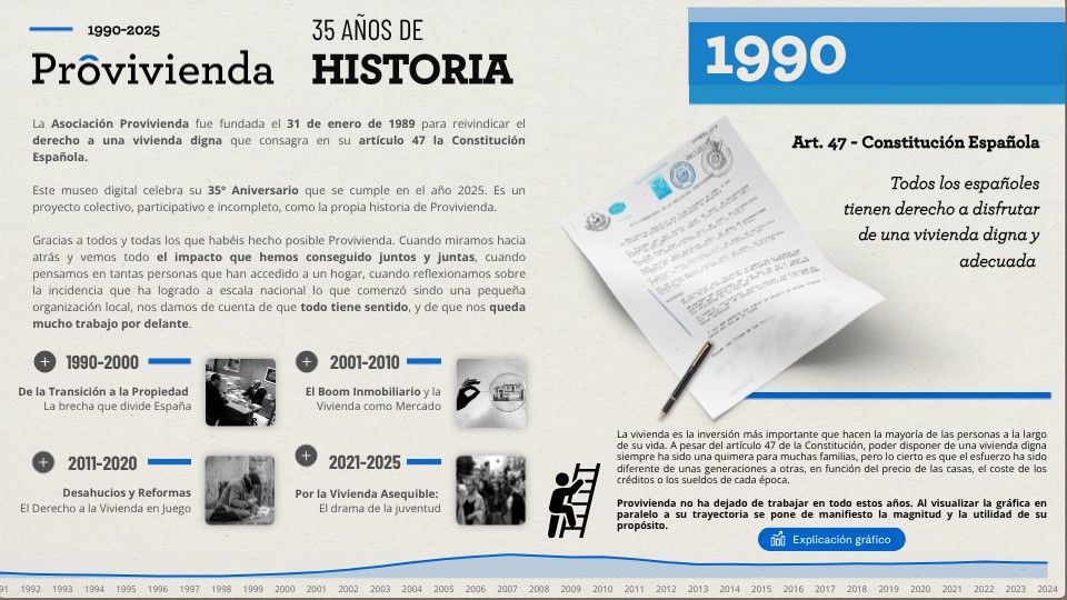 La Asociación Provivienda fue fundada el 31 de enero de 1989 para reivindicar el derecho a una vivienda digna que consagra en su artículo 47 la Constitución Española. Este museo digital celebra su 35º Aniversario que se cumple en el año 2025. Es un proyecto colectivo, participativo e incompleto, como la propia historia de Provivienda. Gracias a todos y todas los que habéis hecho posible Provivienda. Cuando miramos hacia atrás y vemos todo el impacto que hemos conseguido juntos y juntas, cuando pensamos en tantas personas que han accedido a un hogar, cuando reflexionamos sobre la incidencia que ha logrado a escala nacional lo que comenzó sindo una pequeña organización local, nos damos de cuenta de que todo tiene sentido, y de que nos queda mucho trabajo por delante.