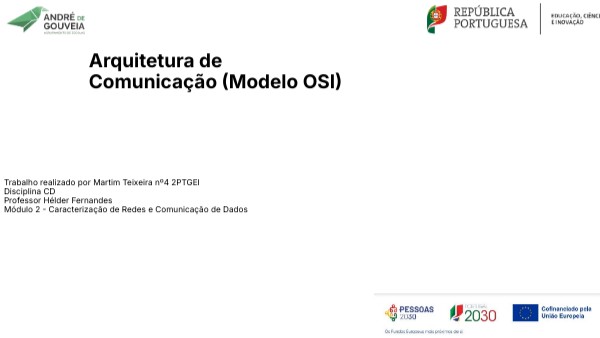 O Modelo OSI tem 7 camadas diferentes e cada uma com uma função diferente: Camada Física: Transmissão de bits através do meio físico (cabos, sinais elétricos) Camada de Ligação de Dados: Comunicação entre dispositivos na mesma rede e controlo de erros de transmissão Camada de Rede: Roteamento de pacotes de dados e endereçamento lógico Camada de Transporte: Garantia de entrega de dados de ponta a ponta, controlo de fluxo e erros (ex: TCP, UDP) Camada de Sessão: Gestão de sessões de comunicação entre aplicações Camada de Apresentação: Tradução, compressão e encriptação de dados. Camada de Aplicação: Interface com o utilizador e serviços de rede (ex: HTTP, FTP)