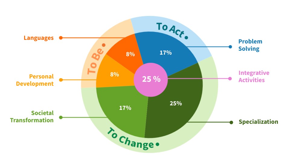 Abilities, captured under the verb “to change”, refer to the ability to innovate, adapt and act with impact. This dynamic is reinforced through practical projects, ethical reflection and a mastery of the knowledge, know-how and interpersonal skills needed to meet challenges and act responsibly in the world.