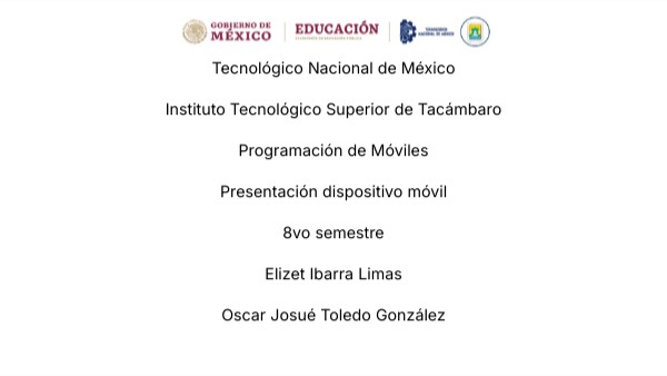 Tecnológico Nacional de México Instituto Tecnológico Superior de Tacámbaro Programación de Móviles Presentación dispositivo móvil 8vo semestre Elizet Ibarra Limas Oscar Josué Toledo González