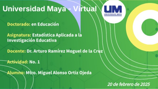 Doctorado: en Educación Asignatura: Estadística Aplicada a la Investigación Educativa Docente: Dr. Arturo Ramírez Moguel de la Cruz Actividad: No. 1 Alumno: Mtro. Miguel Alonso Ortiz Ojeda
