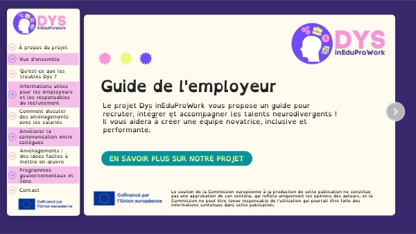 Le projet DysinEduProWork vise à combler le fossé de l'inclusion des personnes présentant des troubles spécifiques de l'apprentissage (troubles Dys ) dans la sphère de l'enseignement professionnel et de la formation professionnelle. S'attaquant aux disparités en matière d'éducation et d'emploi à travers l'Europe, le projet a mis au point une série d'outils et de ressources pratiques visant à améliorer les résultats professionnels des personnes neurodivergentes. D'autres outils sont disponibles ici :