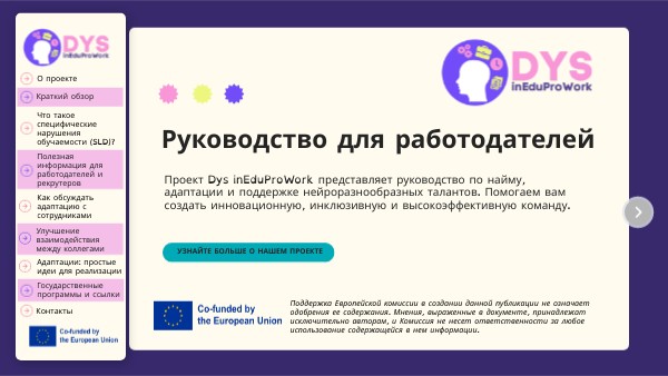 Проект Dys inEduProWork представляет руководство по найму, адаптации и поддержке нейроразнообразных талантов. Помогаем вам создать инновационную, инклюзивную и высокоэффективную команду.