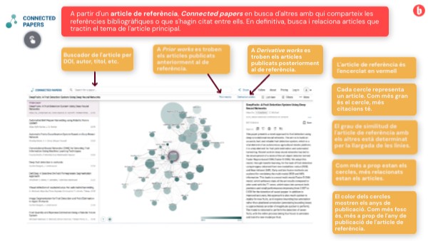 A partir d'un article de referència, Connected papers en busca d'altres amb qui comparteix les referències bibliogràfiques o que s'hagin citat entre ells. En definitiva, busca i relaciona articles que tractin el tema de l'article principal.