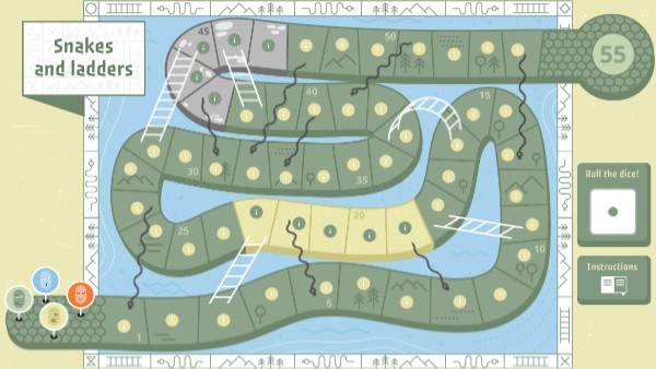 Players start with a token - which represents each of them - in the initial square and take turns rolling the die. The tokens move according to the numbering on the board, in ascending order. If, at the end of a move, a player lands on a square where a ladder begins, they move up it to the square where it ends. If, on the other hand, they land on a square where a snake's tail begins, they move down it to the square where its head ends. If a player rolls a 6, they can move twice in a single turn. If a player rolls three consecutive 6's, they must return to the initial square and cannot move their token until they roll a 6 again. The player who reaches the final square is the winner. There is a variation where, if a player is six or fewer squares away from the end, they must roll precisely the number needed to reach it. If the number rolled exceeds the number of remaining squares, the player cannot move.