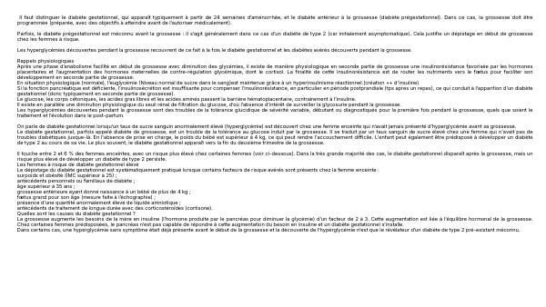 Il faut distinguer le diabète gestationnel, qui apparaît typiquement à partir de 24 semaines d’aménorrhée, et le diabète antérieur à la grossesse (diabète prégestationnel). Dans ce cas, la grossesse doit être programmée (préparée, avec des objectifs à atteindre avant de l’autoriser médicalement). Parfois, le diabète prégestationnel est méconnu avant la grossesse : il s’agit généralement dans ce cas d’un diabète de type 2 (car initialement asymptomatique). Cela justifie un dépistage en début de grossesse chez les femmes à risque. Les hyperglycémies découvertes pendant la grossesse recouvrent de ce fait à la fois le diabète gestationnel et les diabètes avérés découverts pendant la grossesse. Rappels physiologiques Après une phase d’anabolisme facilité en début de grossesse avec diminution des glycémies, il existe de manière physiologique en seconde partie de grossesse une insulinorésistance favorisée par les hormones placentaires et l’augmentation des hormones maternelles de contre-régulation glycémique, dont le cortisol. La finalité de cette insulinorésistance est de router les nutriments vers le fœtus pour faciliter son développement en seconde partie de grossesse. En situation physiologique (normale), l’euglycémie (Niveau normal de sucre dans le sang)est maintenue grâce à un hyperinsulinisme réactionnel.(création ++ d'insuline) Si la fonction pancréatique est déficiente, l’insulinosécrétion est insuffisante pour compenser l’insulinorésistance, en particulier en période postprandiale (tps apres un repas), ce qui conduit à l’apparition d’un diabète gestationnel (donc typiquement en seconde partie de grossesse). Le glucose, les corps cétoniques, les acides gras libres et les acides aminés passent la barrière hématoplacentaire, contrairement à l’insuline. Il existe en parallèle une diminution physiologique du seuil rénal de filtration du glucose, d’où l’absence d’intérêt de surveiller la glycosurie pendant la grossesse. Les hyperglycémies découvertes pendant la grossesse sont des troubles de la tolérance glucidique de sévérité variable, débutant ou diagnostiqués pour la première fois pendant la grossesse, quels que soient le traitement et l’évolution dans le post-partum. On parle de diabète gestationnel lorsqu’un taux de sucre sanguin anormalement élevé (hyperglycémie) est découvert chez une femme enceinte qui n’avait jamais présenté d’hyperglycémie avant sa grossesse. Le diabète gestationnel, parfois appelé diabète de grossesse, est un trouble de la tolérance au glucose induit par la grossesse. Il se traduit par un taux sanguin de sucre élevé chez une femme qui n'avait pas de troubles diabétiques jusque-là. En l'absence de prise en charge, le poids du bébé est supérieur à 4 kg, ce qui peut rendre l'accouchement difficile. L'enfant peut également être prédisposé à développer un diabète de type 2 au cours de sa vie. Le plus souvent, le diabète gestationnel apparaît vers la fin du deuxième trimestre de la grossesse. Il touche entre 2 et 6 % des femmes enceintes, avec un risque plus élevé chez certaines femmes (voir ci-dessous). Dans la très grande majorité des cas, le diabète gestationnel disparaît après la grossesse, mais un risque plus élevé de développer un diabète de type 2 persiste. Les femmes à risque de diabète gestationnel élevé Le dépistage du diabète gestationnel est systématiquement pratiqué lorsque certains facteurs de risque avérés sont présents chez la femme enceinte : surpoids et obésité (IMC supérieur à 25) ; antécédents personnels ou familiaux de diabète ; âge supérieur à 35 ans ; grossesse antérieure ayant donné naissance à un bébé de plus de 4 kg ; fœtus grand pour son âge (mesure faite à l’échographie) ; présence d’une quantité anormalement élevé de liquide amniotique ; antécédents de traitement de longue durée avec des corticostéroïdes (cortisone). Quelles sont les causes du diabète gestationnel ? La grossesse augmente les besoins de la mère en insuline (l’hormone produite par le pancréas pour diminuer la glycémie) d’un facteur de 2 à 3. Cette augmentation est liée à l’équilibre hormonal de la grossesse. Chez certaines femmes prédisposées, le pancréas n’est pas capable de répondre à cette augmentation du besoin en insuline et un diabète gestationnel s’installe. Dans certains cas, une hyperglycémie sans symptôme était déjà présente avant le début de la grossesse et la découverte de l’hyperglycémie n’est que le révélateur d’un diabète de type 2 pré-existant méconnu.