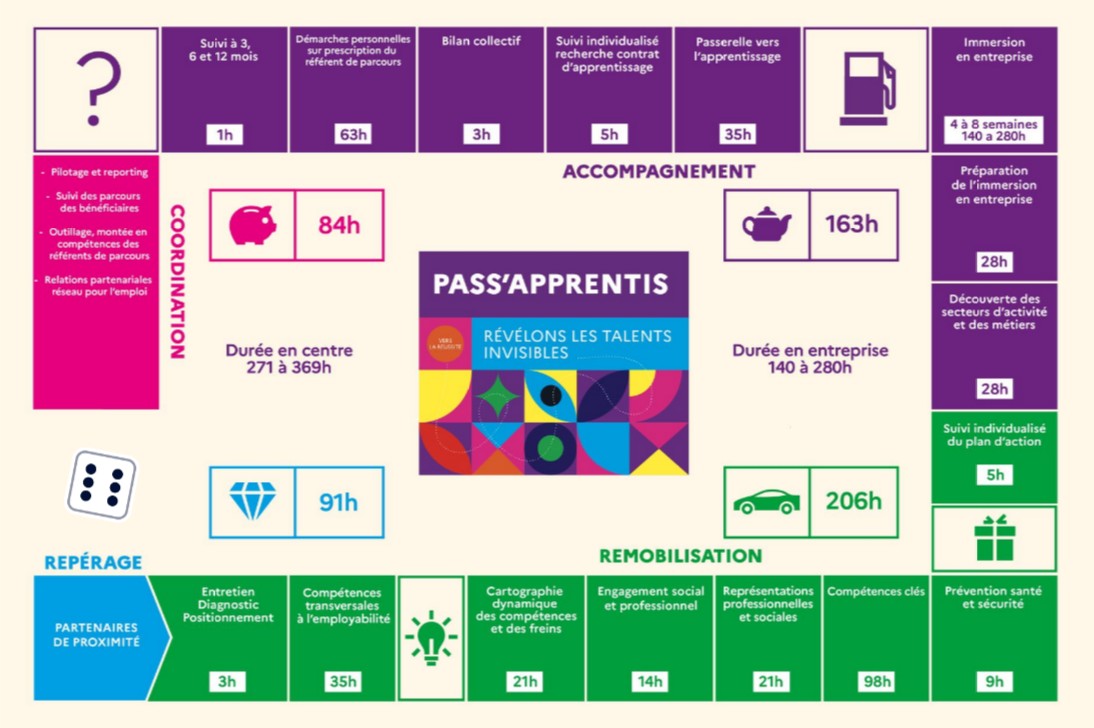 Entretien individuel : 1h Diagnostic Positionnement : 1h Contrat d’engagement : il est signé au terme du diagnostic positionnement Parcours personnalisé : en fonction de son profil le bénéficiaire s’engage dans un cheminement selon son évolution et construit son projet jusqu’à la signature d’un contrat d’apprentissage ou autre sortie positive Restitution des positionnements : 1h