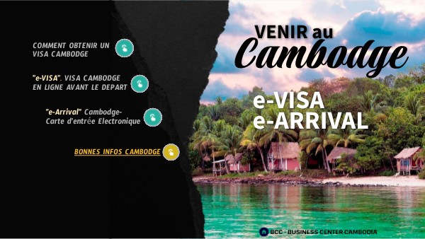 - Demander en ligne, un VISA pour entrer au Cambodge. Obtention en 3 jours. Vous avez 2 choix de Visas : 1- Visa tourist (30$), 2- Visa E (35$). Demander son e-VisaUne fois entré sur le territoire, la validité de ce Visa sera d'1 mois. Durant ce mois, pour le VISA E, BCC vous fait votreVISA BUSINESS ou VISA RETRAITE long terme.