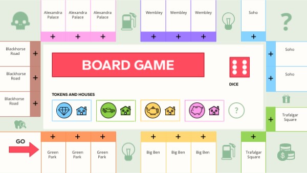 Each player must choose a color: blue, green, yellow or pink. He/she gets a tile to mark his/her position and 10 houses to indicate the properties he/she acquires during the game. Each player must take the tile of his/her color and place it on the starting square. To start playing, click on the dice and move your piece to the corresponding square. In each square there must be one or more questions. If you get it right, place one of your houses on that square - congratulations, you have a new property! Special squares: the squares with icons contain penalties such as "Player pays electricity tax: loses 2 houses". Get the question right to avoid the penalty! The player who has the highest number of houses on the board once all the squares are occupied wins.