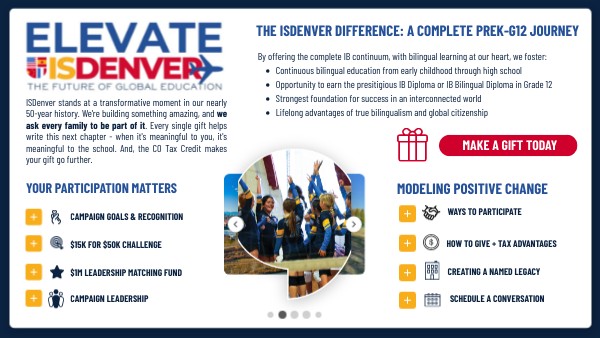 ISDenver stands at a transformative moment in our nearly 50-year history. We're building something amazing, and we ask every family to be part of it. Every single gift helps write this next chapter - when it's meaningful to you, it's meaningful to the school. And, the CO Tax Credit makes your gift go further.