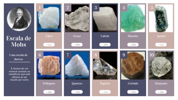 Esta escala é composta por dez termos que correspondem a dez minerais que apresentam diferente dureza, de acordo com a posição que ocupam nessa escala