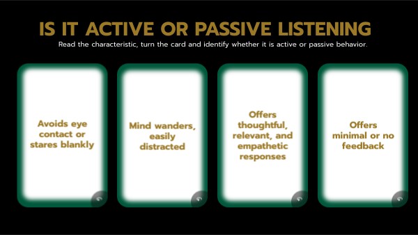 A quick set of 8 flash cards where participants determine whether the behavior is active or passive listening