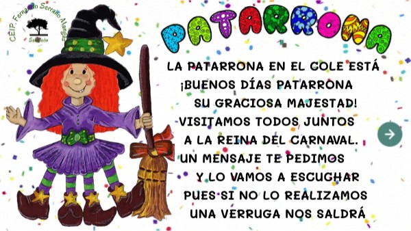 LA PATARRONA EN EL COLE ESTÁ ¡BUENOS DÍAS PATARRONA SU GRACIOSA MAJESTAD! VISITAMOS TODOS JUNTOS A LA REINA DEL CARNAVAL. UN MENSAJE TE PEDIMOS Y LO VAMOS A ESCUCHAR PUES SI NO LO REALIZAMOS UNA VERRUGA NOS SALDRÁ